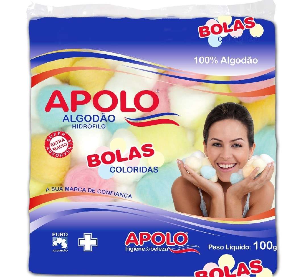 AS BOLAS DE ALGODÃO APOLO. SÃO COMPOSTAS POR FIBRAS NATURAIS. 100% PURO ALGODÃO HIDRÓFILO QUE ASSEGURAM A MACIEZ E ALTO PODER DE ABSORÇÃO.